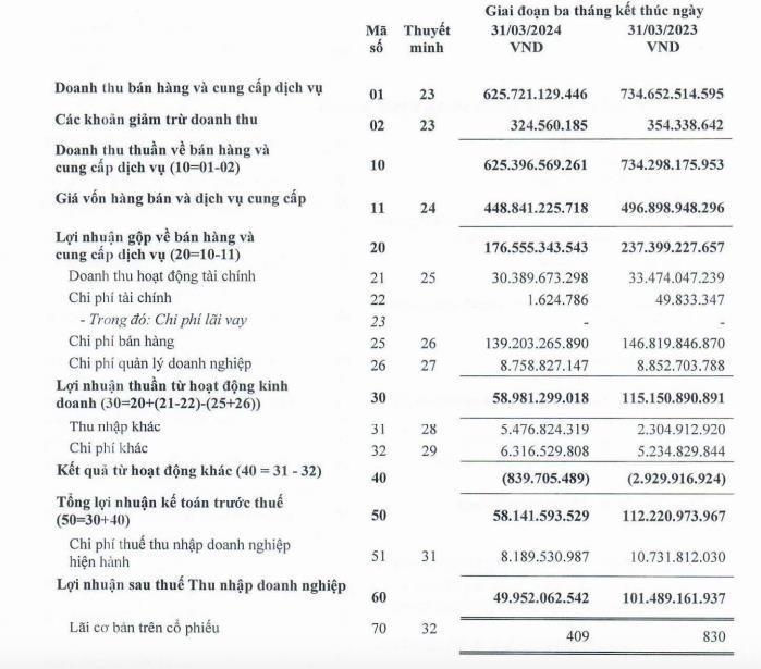 Công ty cho biết doanh thu bán hàng trong kỳ giảm do ảnh hưởng từ tình hình kinh tế quý I còn khó khăn, dẫn đến sức mua của người tiêu dùng giảm. Ngoài ra, thu nhập tài chính cũng giảm do lãi suất tiền gửi giảm.