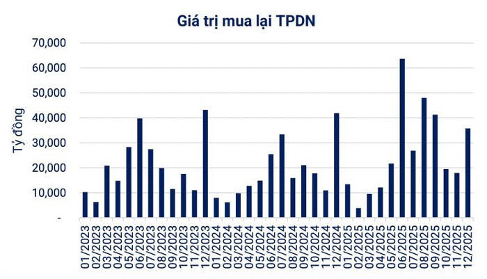 Ở chiều ngược lại, trong tháng 12/2025, các doanh nghiệp đã mua lại trước hạn 35.820 tỷ đồng trái phiếu, giảm khoảng 15% so với cùng kỳ năm trước.