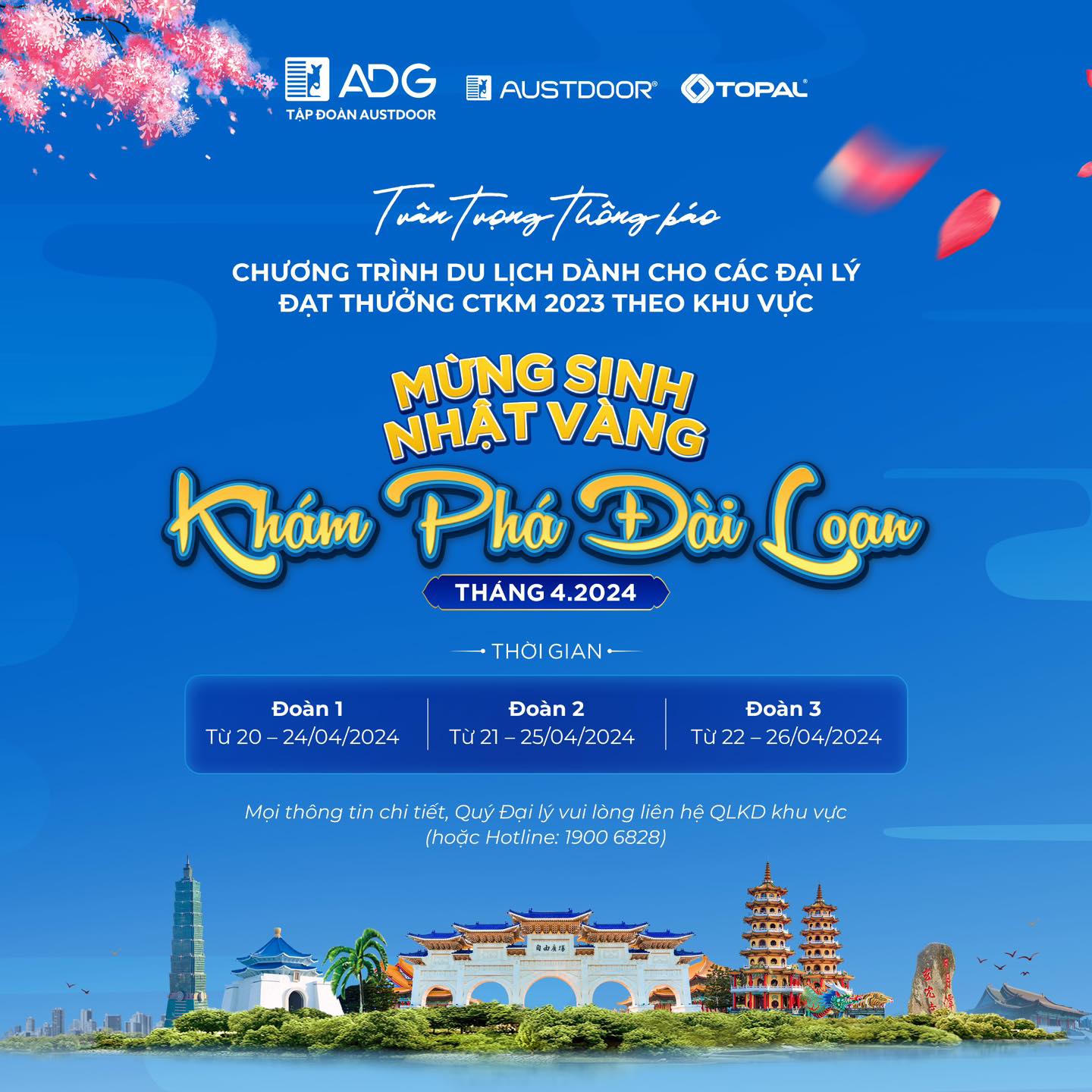 Hành trình khám phá quốc đảo Đài Loan sẽ diễn ra trong 5 ngày 4 đêm với nhiều điểm đến ấn tượng và hoạt động hấp dẫn, hứa hẹn sẽ mang đến nhiều trải nghiệm mới dành cho các thành viên tham gia. Đây cũng là cơ hội để các Nhà phân phối & Đại lý kinh doanh có thể giao lưu, chia sẻ kết nối và gia tăng mối quan hệ hợp tác cùng phát triển. Chương trình được tổ chức thành 3 đoàn nối tiếp trong khoảng thời gian từ 20/04 đến 26/04/2023 để đảm bảo chất lượng chương trình được tốt nhất. Mọi thông tin về hành trình sẽ được cập nhật tại website: austdoorgroup.vn/Fanpage Tập đoàn Austdoor.