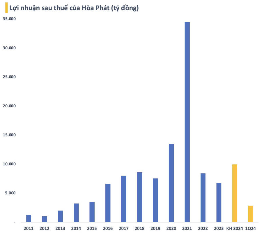 Về kế hoạch kinh doanh năm 2024, Hòa Phát đặt mục tiêu doanh thu 140.000 tỷ và lợi nhuận sau thuế 10.000 tỷ đồng, lần lượt tăng 16% và 47% so với thực hiện năm 2023. Quý đầu năm, doanh nghiệp đầu ngành thép ghi nhận lợi nhuận sau thuế gần 2.900 tỷ đồng, gấp 7,5 lần cùng kỳ 2023. Với kết quả này, Hòa Phát đã thực hiện 29% kế hoạch lợi nhuận cả năm đề ra.