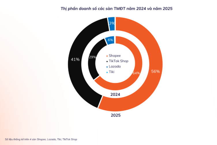 Mặc dù vẫn giữ vị thế chủ đạo, đà tăng trưởng của Shopee có dấu hiệu chậm lại trước sự cạnh tranh từ mô hình mới. Ở chiều ngược lại, TikTok Shop ghi nhận sự gia tăng thị phần đáng kể, từ mức 29% trong năm 2024 lên 41,31% vào năm 2025.