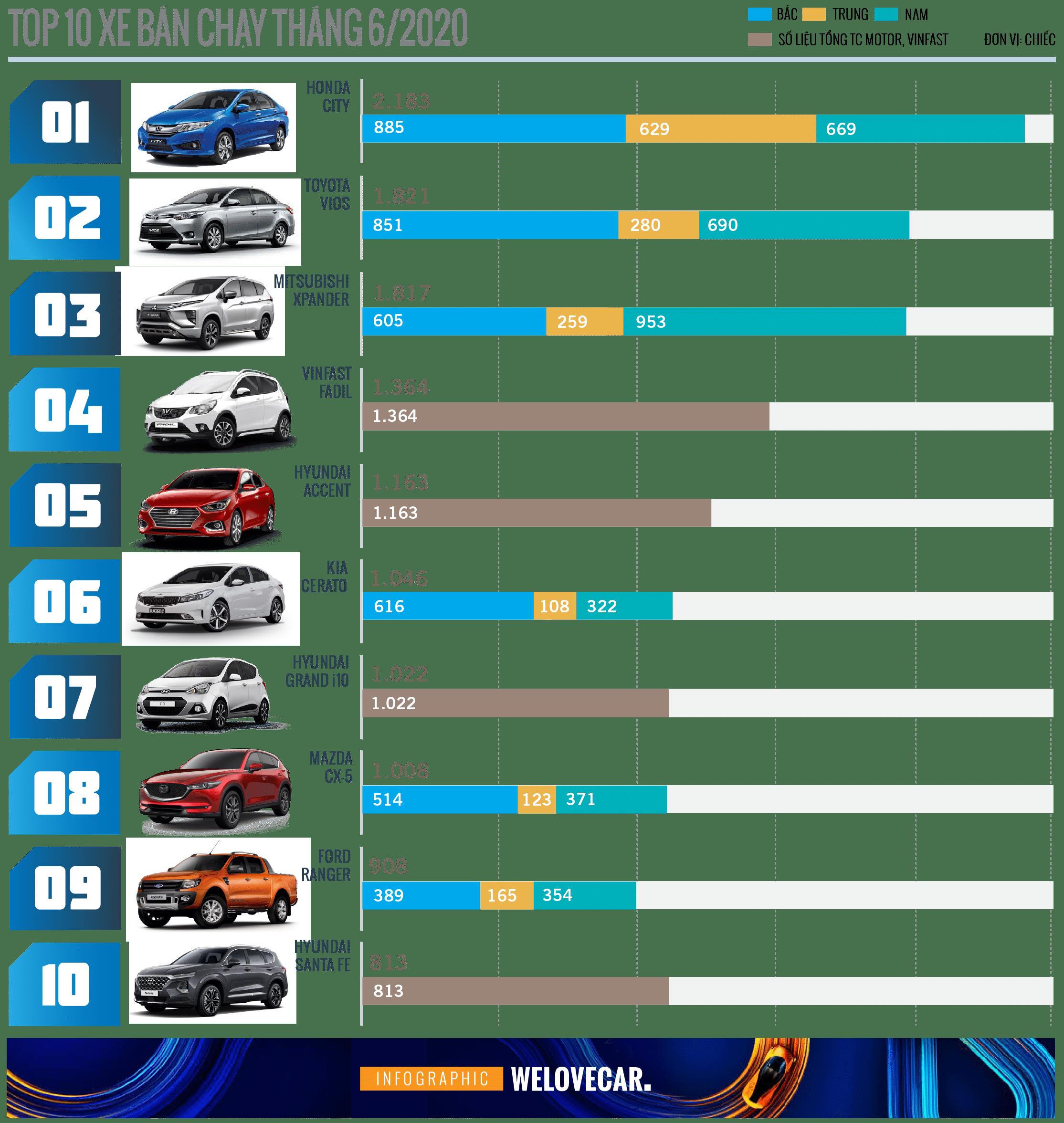 Hết tháng 6/2020, Honda công bố bán được 2.183 xe Honda City, trở thành mẫu ô tô bán chạy nhất, theo VAMA.
