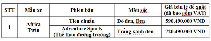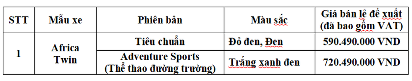 Africa Twin với hai phiên bản dự kiến sẽ được bán chính thức tại hệ thống Cửa hàng xe Phân khối lớn Honda trên toàn quốc vào ngày 15/02/2023 với chế độ bảo hành 2 năm, không giới hạn km và giá bán như sau: