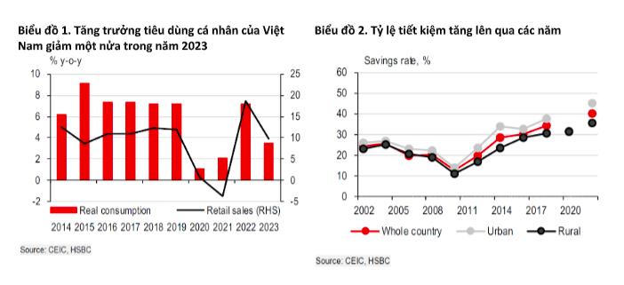 Trên thực tế, Việt Nam có tỷ trọng tiêu dùng lớn chiếm hơn 50% GDP. Gia tăng với tốc độ bình quân hàng năm là 7,5% trước đại dịch, tiêu dùng cá nhân đã giảm sút đáng kể từ khi xảy ra dịch bệnh, ngoại trừ giai đoạn mở cửa trở lại trong năm 2022. Đặc biệt, tăng trưởng tiêu dùng cá nhân đã giảm một nửa trong năm 2023, phản ánh tác động rõ rệt của tình hình kinh tế chậm lại đối với các hộ gia đình.