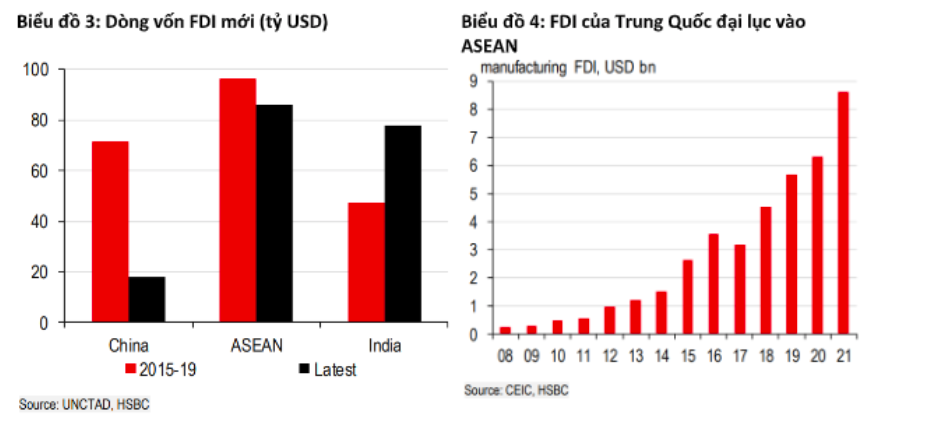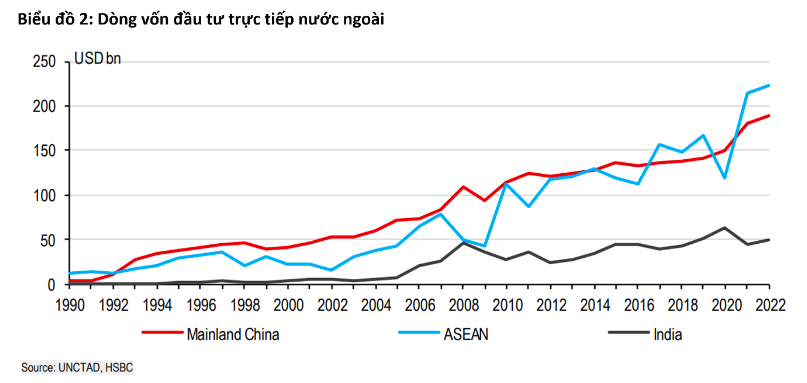Cũng theo các nhà phân tích của HSBC, năm ngoái, nền kinh tế này đã nhận được lượng đầu tư cao kỷ lục mặc dù nhu cầu sụt giảm và những thách thức đi kèm với chiến lược "Zero Covid". Tuy nhiên, dòng vốn chảy vào ASEAN đã tăng vọt, khu vực này nhận được nhiều vốn hơn Trung Quốc đại lục trong hai năm liên tiếp.