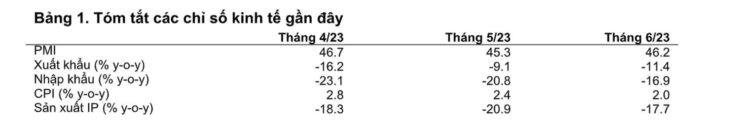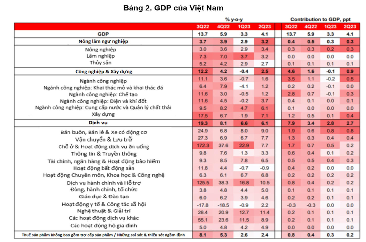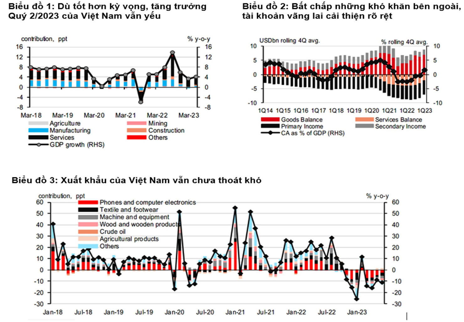 Tốc độ tăng trưởng 4,1% so với cùng kỳ năm trước, GDP quý II vượt qua mức kỳ vọng 3,8% của thị trường. Nhìn chung, tốc độ tăng trưởng của Việt Nam đã giảm mạnh từ mức ấn tượng của năm ngoái (8%), chủ yếu do các rủi ro bên ngoài. Thương mại, một trong những động lực tăng trưởng chính của Việt Nam dần suy yếu kể từ quý IV/2022.