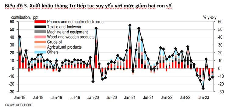 Sau khi giảm 12% so với cùng kỳ trong quý I/2023, xuất khẩu tiếp tục mức giảm hai con số, với chỉ số tháng 4/2023 thấp hơn 11,7% so với cùng kỳ. Khó khăn này diễn ra trên diện rộng, với các ngành xuất khẩu chính như dệt may/giày dép, điện thoại thông minh và đồ nội thất gỗ đều sụt giảm đáng kể.