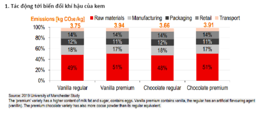 Bên cạnh đó, HSBC cho rằng các nhà đầu tư nên xem xét ngành kem bị ảnh hưởng như thế nào bởi biến đổi khí hậu và cách các công ty ứng phó với những thách thức này. Ví dụ, nhiệt độ tăng ảnh hưởng đến năng suất sản xuất sữa bò; trong điều kiện khí hậu nóng, bò có xu hướng ăn ít hơn và làm giảm sản lượng sữa. Thiếu nước do biến đổi khí hậu cũng là một thách thức không nhỏ vì sản phẩm sữa là loại thực phẩm đứng thứ ba về tiêu thụ nước.