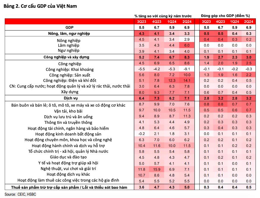 Với kết quả tăng trưởng tốt hơn kỳ vọng trong 6 tháng đầu năm, HSBC nâng dự báo tăng trưởng GDP năm nay lên 6,5% (trước đây là 6%). Điều này đồng nghĩa Việt Nam có khả năng trở thành nền kinh tế tăng trưởng nhanh nhất ASEAN trong năm 2024, vị trí Việt Nam đã tạm nhường cho Malaysia và Philippines trong năm 2022 và 2023.