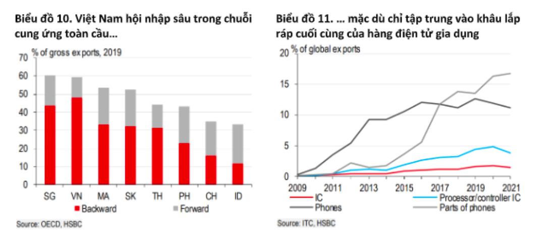 Mặc dù vậy, sự gia tăng hội nhập lại chủ yếu diễn ra thông qua liên kết ngược nhiều hơn. Việt Nam hiện tại được định vị là trung tâm nhập khẩu đầu vào trung gian phức tạp cho khâu lắp ráp cuối cùng, minh chứng là tỷ lệ nội địa hóa thấp trong ngành hàng điện tử", HSBC nhận định.