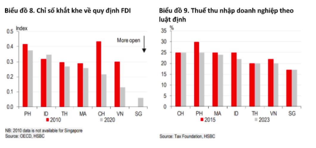HSBC nhận định, một phần nguyên nhân của môi trường đầu tư thuận lợi có thể lý giải là nhờ sự hỗ trợ tích cực từ phía chính phủ thông qua hệ thống thuế. Việt Nam có vị thế cạnh tranh so với các quốc gia khác nhờ mức thuế thu nhập doanh nghiệp theo luật định 20%.