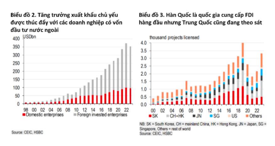 "Nỗ lực của những doanh nghiệp thâm nhập thị trường sớm này đã khuyến khích các tập đoàn công nghệ lớn khác đầu tư vào năng lực sản xuất của Việt Nam", báo cáo HSBC nhận định và cho biết thêm, năm 2023, các công ty sản xuất Trung Quốc hàng đầu đã đẩy mạnh đầu tư vào Việt Nam, với gần 20% vốn FDI đăng ký mới bắt nguồn từ Trung Quốc đại lục.