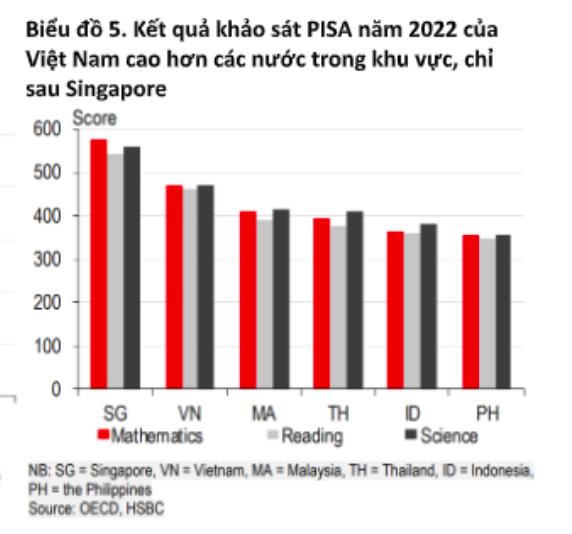 Trong đó, so sánh chi phí lao động ở châu Á, mức lương nhân công sản xuất ở Việt Nam thấp hơn ở Trung Quốc và các quốc gia khác, dù người dân Việt Nam có trình độ giáo dục phổ thông vững vàng, thể hiện qua kết quả khảo sát PISA của Việt Nam ở mức cao, là chương trình đánh giá học sinh quốc tế khảo sát kiến thức và kỹ năng của học sinh 15 tuổi.