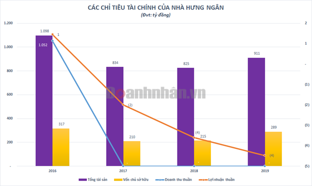 Đến cuối năm 2019, quy mô tổng tài sản của Nhà Hưng Ngân ở mức 911 tỷ đồng và vốn chủ sở hữu 289 tỷ đồng, lần lượt tăng 10,4% và 34,4% so với năm trước. Tuy nhiên, so với cuối năm 2016, quy mô của doanh nghiệp bất động sản này đã bị thu hẹp đáng kể.