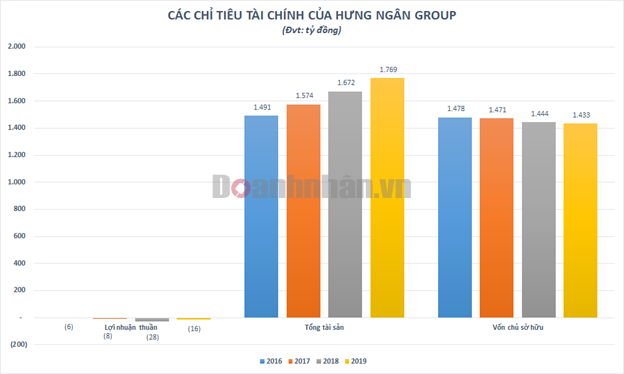 Liên tục mở rộng quy mô trong những năm qua, tổng tài sản của Hưng Ngân đạt mức 1.769 tỷ đồng cuối năm 2019. Tuy nhiên, kết quả kinh doanh lại không có sự tăng trưởng tương xứng, thậm chí doanh nghiệp này còn không phát sinh doanh thu đồng thời báo lỗ triền miên trong suốt giai đoạn 4 năm từ 2016 đến 2019.