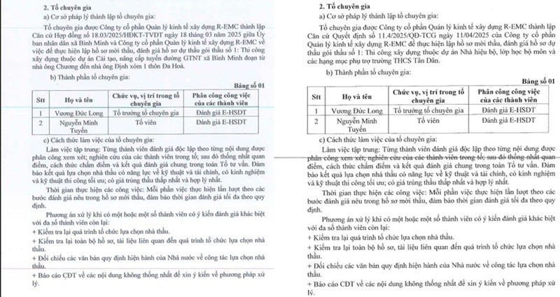 Tổ chuyên gia được Công ty R-EMC thành lập Căn cứ Hợp đồng số 18.03/2025/HĐKT-TVĐT ngày 18/03/2025 giữa UBND xã Bình Minh và Công ty R-EMC về việc để thực hiện lập hồ sơ mời thầu, đánh giá hồ sơ dự thầu gói thầu số 1: Thi công xây dựng thuộc dự án Cải tạo, nâng cấp tuyến đường GTNT xã Bình Minh đoạn từ nhà ông Chương đến nhà ông Định xóm 1 thôn Đa Hoà.