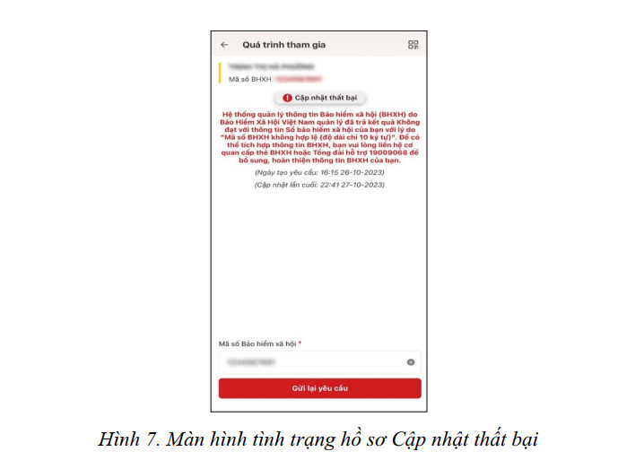 - Đối với hồ sơ có tình trạng Cập nhật thất bại, công dân nhập Mã số Bảo hiểm xã hội và ấn Gửi lại yêu cầu để thực hiện gửi lại yêu cầu tích hợp.
