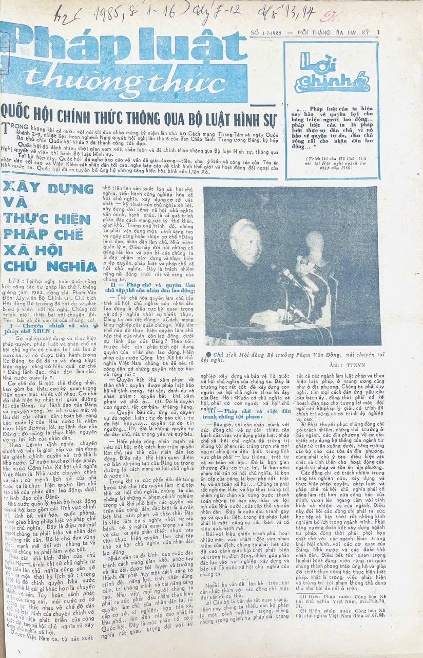 Cũng tại trang bìa số đầu tiên, đã giới thiệu bài nói chuyện của đồng chí Phạm Văn Đồng, Chủ tịch Hội đồng Bộ trưởng tại Hội nghị toàn quốc tổng kết công tác tư pháp lần thứ 1, tháng giêng năm 1983 về “Xây dựng và thực hiện pháp chế Xã hội chủ nghĩa”.