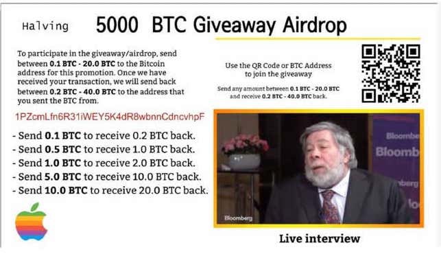 Ảnh bằng chứng cho thấy khuôn mặt của Wozniak xuất hiện trong video tặng 5.000 hoặc 10.000 Bitcoin. Không chỉ đồng sáng lập Apple, các video còn bao gồm hình ảnh của 17 nhân vật nổi tiếng như Elon Musk, Bill Gates, chuyên gia tài chính Robert Kiyosaki...