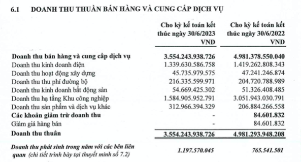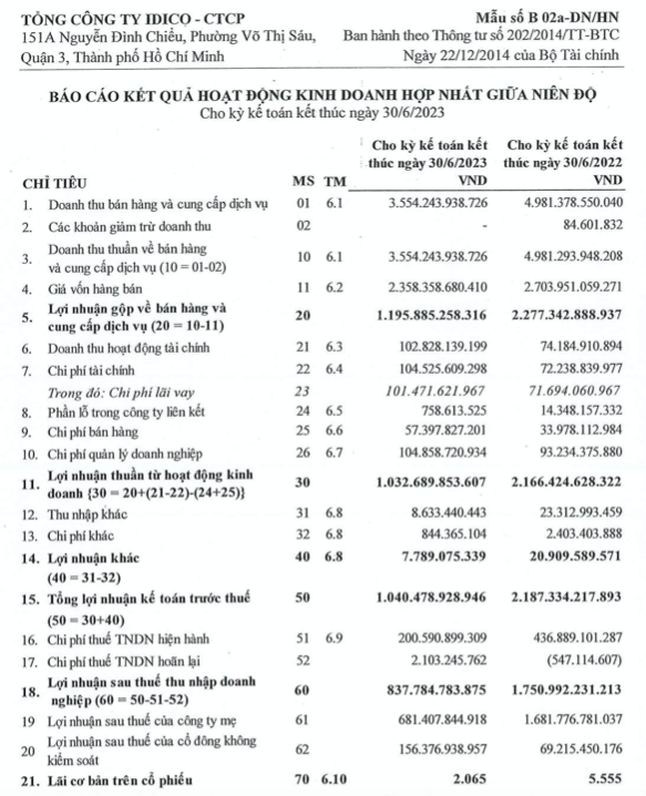 Về tình hình kinh doanh, theo báo cáo kinh doanh hợp nhất giữa niên độ 2023, trong 6 tháng đầu năm, Idico ghi nhận doanh thu thuần 3.554 tỷ đồng, giảm 29% so với nửa đầu năm ngoái.