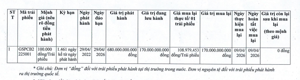 Ngày 9/4/2026, doanh nghiệp này đã mua lại 170 tỷ đồng trái phiếu GSPCB2225001, qua đó tất toán xong lô trái phiếu này.