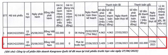 Ngoài ra, Kangaroo Group không ghi nhận có dư nợ trái phiếu nhờ doanh nghiệp đã mua lại 102 tỷ đồng trái phiếu mã KGRCH2225001 trước hạn vào ngày 27/6/2023.