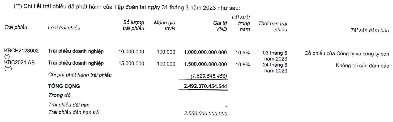 Ghi nhận trên BCTC hợp nhất kiểm toán năm 2022, dư nợ trái phiếu của KBC vào cuối năm ngoái còn 3.900 tỷ. Tuy nhiên, sau nhiều đợt mua lại trái phiếu trước hạn, con số trên đã giảm xuống còn 2.500 tỷ đồng tại thời điểm 31/3.