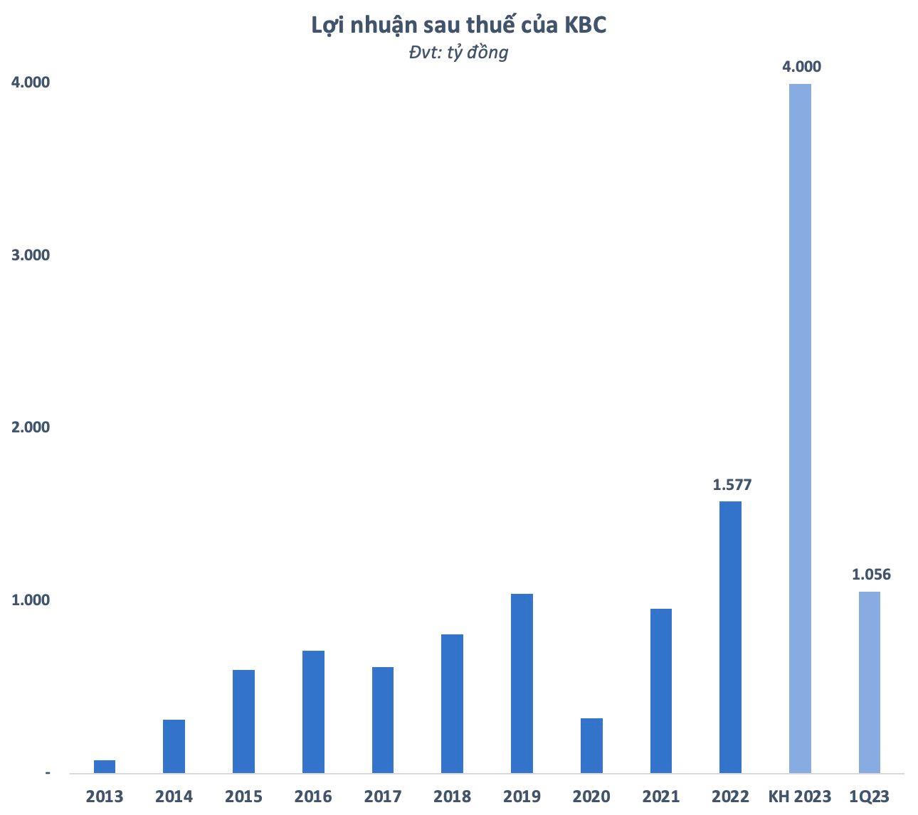 Quý 1/2023, KBC ghi nhận doanh thu thuần đạt hơn 2.223 tỷ đồng, gấp 3,2 lần cùng kỳ và là mức cao nhất trong một quý kể từ khi hoạt động. Sau khi trừ chi phí, KBC lãi ròng hơn 1.056 tỷ đồng, gấp đôi so với cùng kỳ. Với kết quả đạt được, doanh nghiệp bất động sản này đã hoàn thành hơn 26% mục tiêu lợi nhuận cả năm.