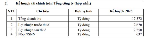 Lợi nhuận sau thuế mục tiêu là 2.250 tỷ đồng, giảm 60% so với thực hiện năm 2022. Đồng thời, đóng góp cho Ngân sách nhà nước dự kiến 637 tỷ đồng.