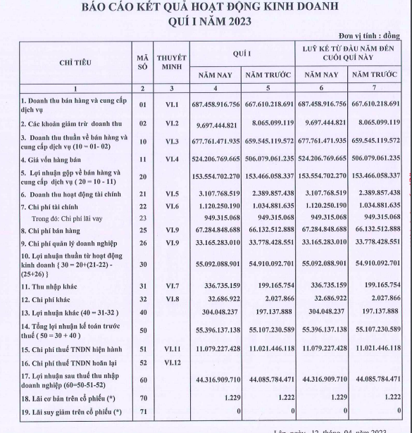 Về kết quả kinh doanh quý I/2023, Bột giặt LIX ghi nhận doanh thu thuần đạt 677,8 tỷ đồng, tăng nhẹ 3% so với cùng kỳ năm 2022. Trong kỳ, lợi nhuận gộp và tổng chi phí gần như đi ngang so với quý I/2022.