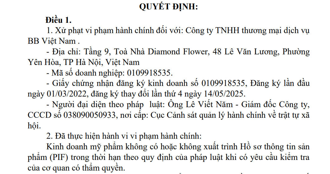 Cụ thể, Công ty TNHH Thương mại Dịch vụ BB Việt Nam có trụ sở tại Tòa nhà Diamond Flower (48 Lê Văn Lương, phường Yên Hòa, Hà Nội), do ông Lê Viết Năm làm người đại diện pháp luật, đã không cung cấp hoặc không xuất trình Hồ sơ thông tin sản phẩm (PIF) khi cơ quan chức năng tiến hành kiểm tra.