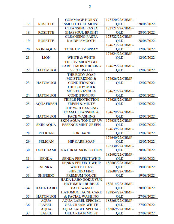 Danh mục sản phẩm vi phạm bao gồm nhiều mặt hàng mỹ phẩm phổ biến trên thị trường, trải rộng ở các nhóm như chăm sóc da, sữa rửa mặt, kem chống nắng và sản phẩm dưỡng thể, đến từ các nhãn hàng quen thuộc như Hatomugi, Skin Aqua, Senka, Anessa, Shiseido, Hada Labo và Aqua Label…