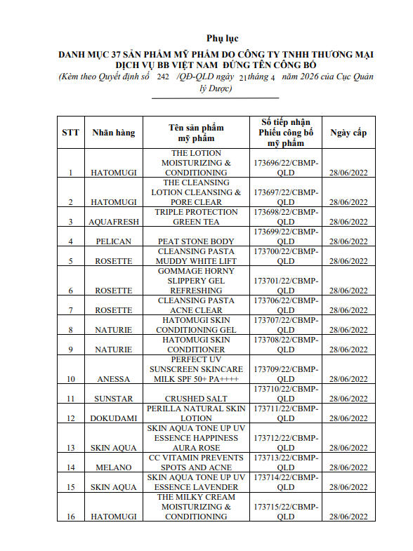 Cục Quản lý Dược (Bộ Y tế) vừa ban hành Quyết định số 242/QĐ-XPHC xử phạt vi phạm hành chính đối với Công ty TNHH Thương mại Dịch vụ BB Việt Nam do kinh doanh mỹ phẩm không xuất trình hồ sơ thông tin sản phẩm theo quy định.