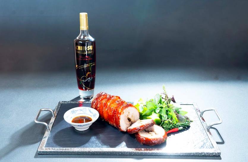 Món thứ hai trong thực đơn của chef Cẩm Thiên Long là món thịt ba rọi cuộn. Nguyên liệu bao gồm ba rọi nguyên tảng, lá é, củ hủ dừa, hạt màng tang và các loại gia vị như nước mắm chinsu cá cơm mùa xuân, dấm rượu vang đỏ, ngò tây, tỏi, ớt, dầu olive...