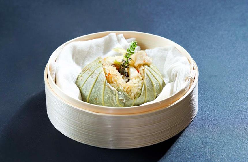 Chef Long sử dụng lá sen tươi để gói xôi đem lại hương vị thơm ngon đặc trưng. Bên trong anh sử dụng 2 phần nhân, một phần đầu tiên là món thịt kho hột vịt, phần thứ hai là nấm đông cô xào chung với tôm khô.