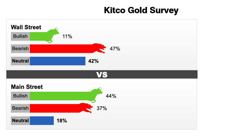 Tuần này, có 19 nhà phân tích Phố Wall đã tham gia Khảo sát vàng của Kitco News. Trong số những người tham gia, có 9 nhà phân tích (tương đương 47%) cho rằng giá vàng sẽ giảm trong thời gian tới. Chỉ có hai nhà phân tích (tương đương 11%) nhận định giá kim loại quý sẽ tăng và 8 nhà phân tích tin tưởng giá đi ngang.