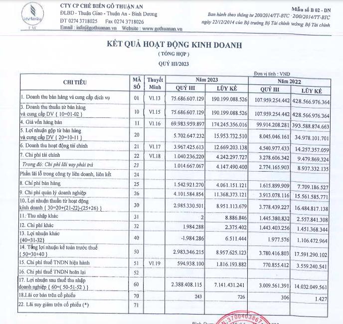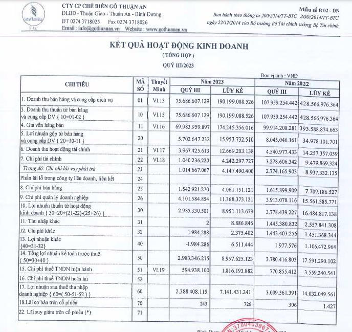 Về kết quả kinh doanh, trong quý III/2023, Gỗ Thuận An ghi nhận doanh thu thuần đạt 75,6 tỷ đồng, giảm 30% so với cùng kỳ năm ngoái. Giá vốn hàng bán giảm 30 tỷ đồng về mức 69,9 tỷ đồng, qua đó khiến lợi nhuận gộp giảm 28,7% so với cùng kỳ, lùi về 5,7 tỷ đồng.