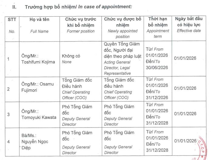 Cụ thể, Ông Osamu Fujimori tiếp tục giữ chức Tổng Giám đốc điều hành nhiệm kỳ 1 năm (từ 01/01 - 31/12/2026). Ông Tomoyuki Kawata được tái bổ nhiệm chức vụ Phó Tổng Giám đốc phụ trách sản xuất và chuyển giao công nghệ, nhiệm kỳ 3 năm, đến hết năm 2028; bà Nguyễn Ngọc Diệp được tái bổ nhiệm chức vụ Phó Tổng Giám đốc phụ trách sản xuất, nhiệm kỳ 3 năm đến hết 2028. Ngày bắt đầu có hiệu lực là 01/01/2026.