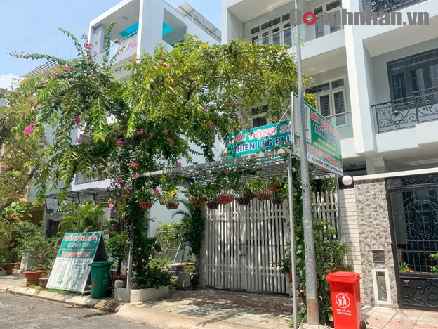 Trong khi đó, trụ sở này treo 3 bảng hiệu to mang tên công ty BĐS Thiên Lộc Phúc chuyên nhận ký gửi, mua bán nhà đất các dự án. Bảng hiệu nhận diện công ty T-S Home khuất sau những lùm cây, chỉ to hơn bảng số nhà vài cm, rất khó để có thể nhìn thấy.