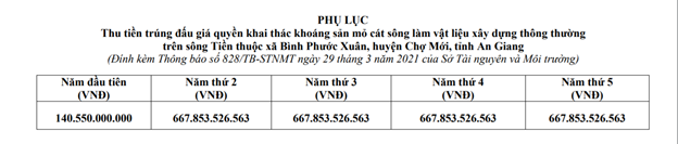 Quyết định cấp phép khai thác cát sẽ được phê duyệt sau khi doanh nghiệp nộp tiền trúng đấu giá năm đầu tiên, chia thành 5 năm.