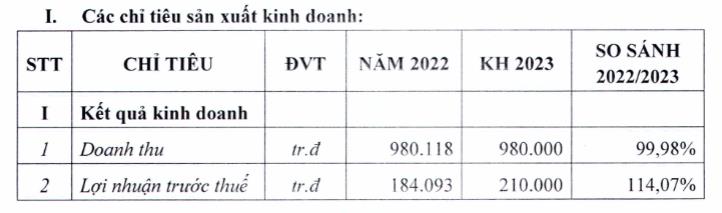 Trong đó, kế hoạch doanh thu dự kiến đạt 980 tỷ, tương đương doanh thu thực hiện năm 2022. Lợi nhuận trước thuế đạt 210 tỷ tăng 14,07% so với thực hiện năm 2022.