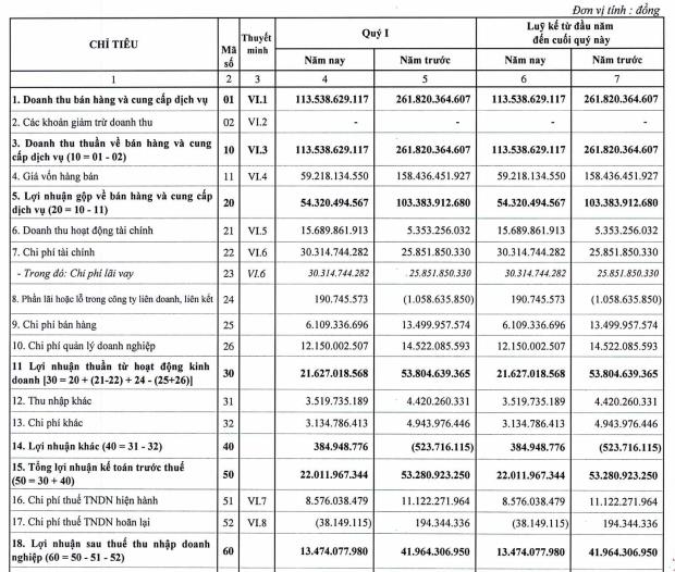 Về tình hình hoạt động kinh doanh của doanh nghiệp, theo công bố Báo cáo tài chính quý 1 năm 2023, doanh nghiệp ghi nhận doanh thu thuần là 113,5 tỷ, giảm mạnh 56,63% so với cùng kỳ năm trước.