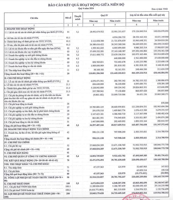 Về tình hình kinh doanh, theo báo cáo tài chính quý IV/2024, DSC ghi nhận doanh thu hoạt động 110 tỷ đồng, giảm 9% so với cùng kỳ.