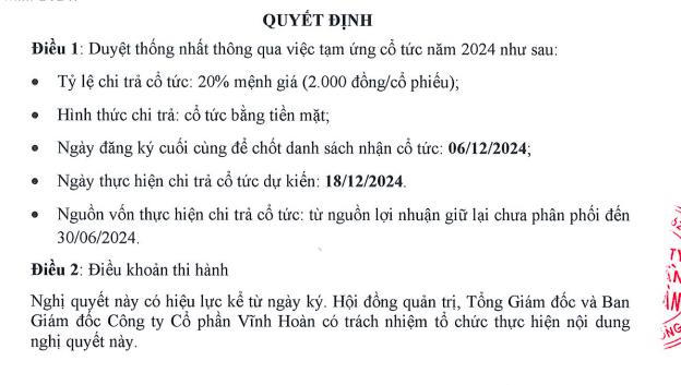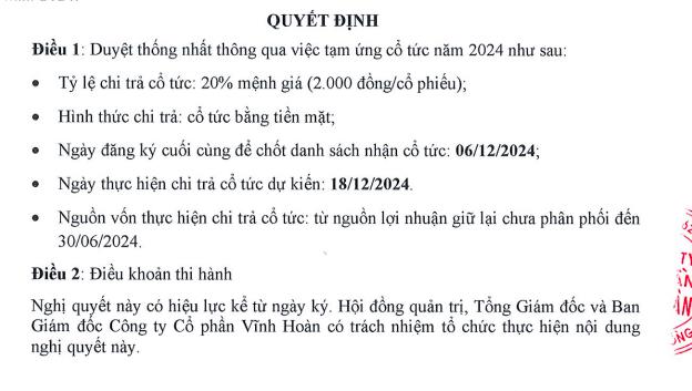 Hội đồng quản trị Công ty cổ phần Vĩnh Hoàn (mã ck: VHC) vừa ra quyết nghị thông qua tạm ứng cổ tức năm 2024 bằng tiền mặt. Ngày đăng ký cuối cùng để chốt danh sách nhận cổ tức là ngày 6/12/2024.
