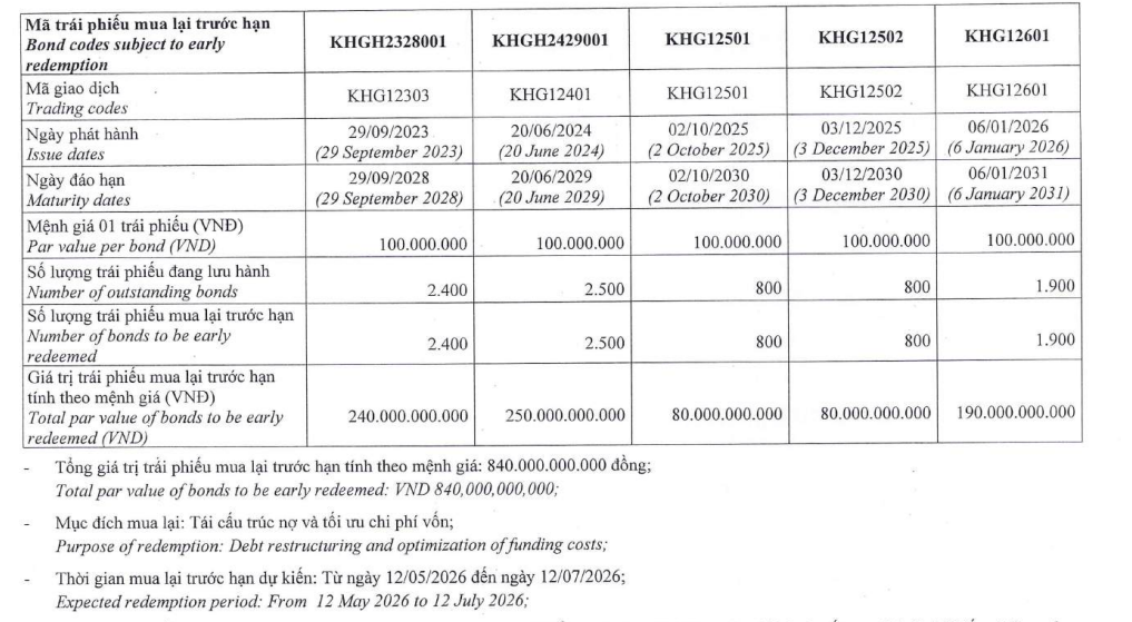 Mã trái phiếu thứ tư là KHG12502 trị giá 80 tỷ đồng, được phát hành ngày 3/12/2025, kỳ hạn 60 tháng. Ngày đáo hạn theo kế hoạch là 3/12/2030.