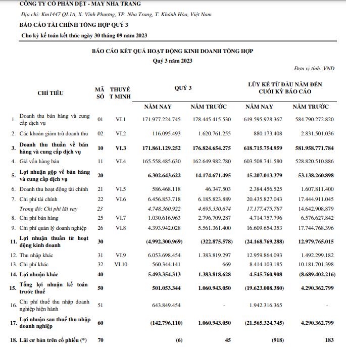 Chi phí tài chính tăng cao, trong khi chi phí bán hàng và chi phí quản lý doanh nghiệp giảm nhẹ. Khấu trừ giá vốn, chi phí, Dệt may Nha Trang báo lỗ 21,5 tỷ đồng trong 9 tháng đầu năm 2023, trong khi cùng kỳ năm ngoái lãi 4,2 tỷ đồng.