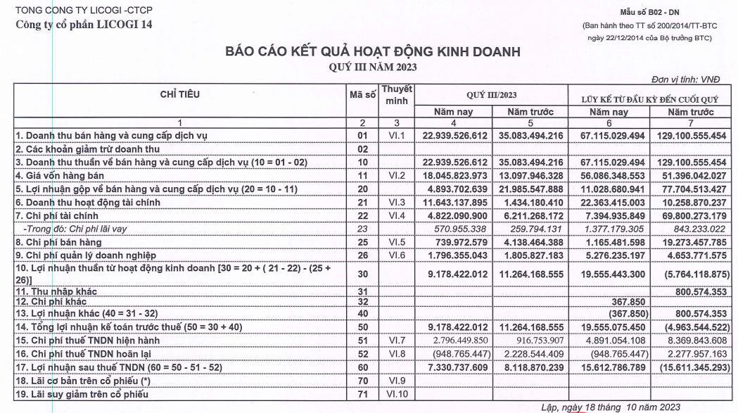 Luỹ kế trong 9 tháng đầu năm 2023, Công ty Licogi 14 ghi nhận doanh thu đạt 67,12 tỷ đồng, giảm 48% so với cùng kỳ. Lợi nhuận sau thuế ghi nhận lãi 15,61 tỷ đồng so với cùng kỳ lỗ 15,6 tỷ đồng.
