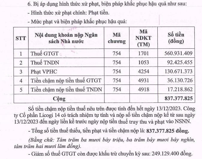Quyết định nêu rõ, L14 đã có hành vi khai sai dẫn đến thiếu số thuế phải nộp. Về hình thức xử phạt, Công ty Licogi 14 sẽ phải nộp tổng cộng 837,3 triệu đồng. do liên quan tới việc thiếu tiền thuế, tiền phạt và tiền chậm nộp thuế.