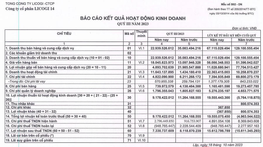 Về bức tranh tài chính, quý III/2023, Licogi 14 ghi nhận doanh thu thuần đạt 22,93 tỷ đồng, giảm 34,6% so với cùng kỳ.