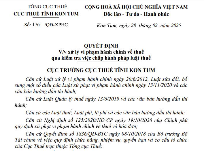 Căn cứ vi phạm, Cục thuế tỉnh Kon Tum quyết định xử phạt 11,4 triệu đồng; truy thu thuế giá trị gia tăng năm 2023 là 57,14 triệu đồng; tiền chậm nộp thuế giá trị gia tăng là 8,2 triệu đồng.
